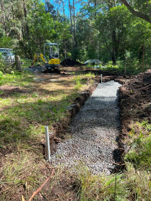 As groundwater accumulates within the surrounding soil, it naturally flows into the gravel trench, enters the perforated pipe, and is redirected away from critical areas to a designated safe discharge point. This system operates efficiently below ground level, eliminating the need for visible grates or channels, making it particularly advantageous in clay-heavy soils, which are prevalent in Wollongong and the broader Illawarra region.